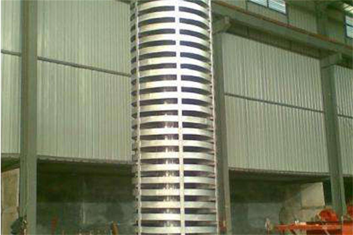 垂直振動輸送機是通過激振器強迫振動,使輸送塔作沿垂直方向的直線振動和繞鉛垂中心軸的扭動振動,兩個振動的合成,使物料朝 螺旋運動的方向斜拋,形成了物料沿螺旋槽向上的輸送過程。垂直振動輸送機是由提升槽、振動電機、減振系統和底座等組成。垂直振動輸送機分開槽式、封閉式兩種結構。